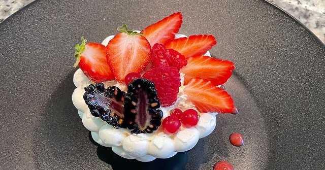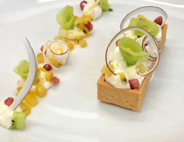Ses entremets, servis à l’assiette, sont un doux mélange de produits locaux. Partisan du circuit court, Romuald choisit des producteurs corses chaque fois que c’est possible. Il magnifie ces produits, tels que la clémentine, l’orange ou la fraise et les combine de manière audacieuse.